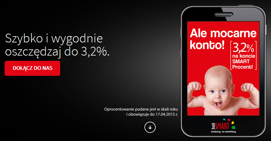 Dziś zmieniło się oprocentowanie na koncie oszczędnościowym w Banku Smart. Zgodnie z przypuszczenie spadło... Osoby które dopiero teraz założą konto oszczędnościowe dostaną maksymalnie 3,2%, ale osoby które otwierały konto w poprzednim cyklu promocji, jeszcze przez jakiś czas będą miały oprocentowanie do 3,5% w skali roku.